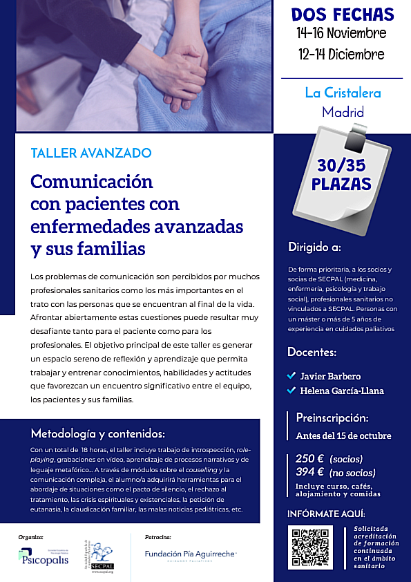 La Sociedad Española de Psicología Paliativa (SEPP-Psicopalis), en colaboración con la Fundación Pía Aguirreche, organiza el TALLER AVANZADO Comunicación con pacientes con enfermedades avanzadas y sus familias.